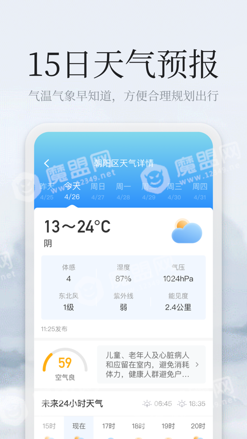4、24小时预报:直观展示未来24小时气温趋势,当日天气变化提前知道;